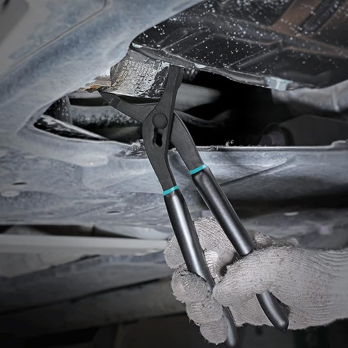 - The oil filter pliers are designed with 2-position slip joints, with strong jaws and serrated teeth, which can clamp the oil filter stably. 12 inches long handle, which can provide you with soft and comfortable touch and non-slip control. The long handle provides easy access to restricted areas, providing more effective leverage for increased torque, a must have for any auto mechanic