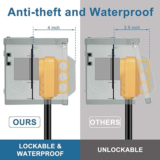 - WEATHERPROOF&ANTI-THEFT: Our 30A power outlet is constructed of heavy gauge iron for durability and protecting the power outlet from element. Doors can be locked to prevent power theft and anyone disconnecting the service. Now you can power your RV, motorhome, electric car, Tesla, generator, welder ect. in a safe and reliable way.
