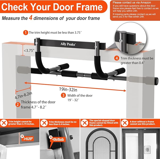 - 💪 CHECK YOUR DOOR FRAME:The door pull up bar - can be used on any standard 24 "to 32" width and 4.7 "to 7.5"depth door frame, Door frame pull up bar uses leverage to hold against the doorway.Installs in seconds.