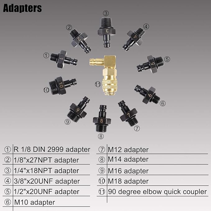 - There are 10 types of thread adapters are suitable for most cars, motorcycles, boats and other vehicles with gasoline and small diesel engines. As long as the adapters can match with your engine and oil pressure does not exceed 140 PSI. The 10 adapters are marked with number, you can choose the right one very easy.