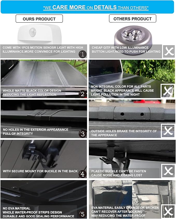 - *Flat and Sleek Design:Improve Gas Saving For Your Driving.Full Weather Condition Sealability,Provide Good Performance On Anti-Snow, Anti-Dusty,Anti-Water,Always Keep The Inside Of Your Truck Bed Clean And Dry.Prevent The Light Goods Lost During Driving, and Keep The Privacy Of Your Truck Bed