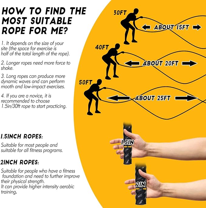 - ✔ Three lengths, two diameters, 30ft, 40ft, 50ft, 1.5in/2in. Customers can adjust the exercise intensity by changing the length and diameter of the rope, which is an ideal choice for amateurs and professionals.