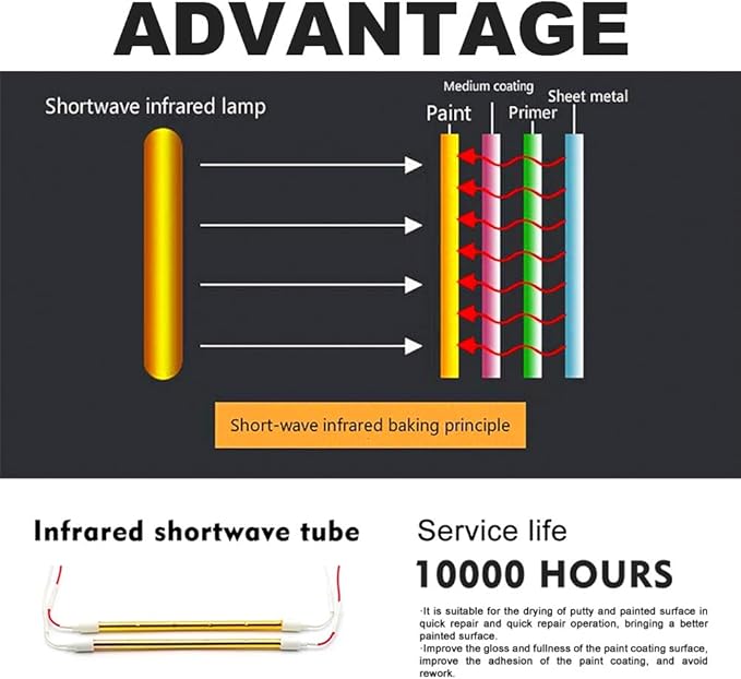 - VARIOUS APPLICATION The Infrared curing lamps are widely used in the auto spray paint room, local paint drying, drying putty, car spray baking booth, and it is the ideal paint tool for spot repairs, engine drying, adhesive stripe removal, drying filler, drying primer or just preheating prior to spraying.