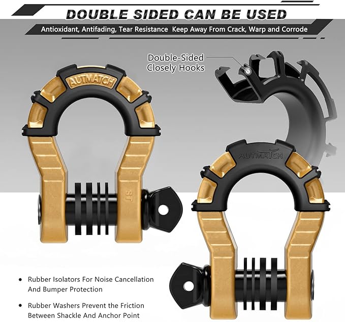 AUTMATCH D Ring Shackles 3/4" Mega Shackle (2 Pack) 68,000Ibs Break Strength - Heavy Duty Clevis Shackles with 7/8" Screw Pin and Isolator Washer for Tow Strap Winch Off Road Vehicle Recovery, Gold