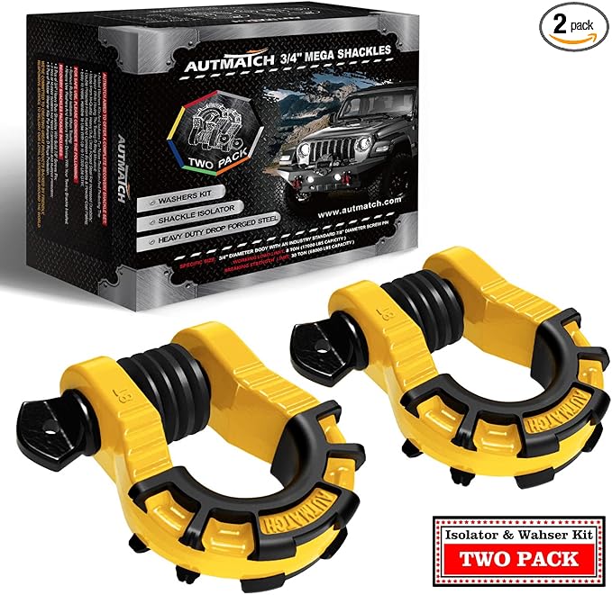 AUTMATCH D Ring Shackles 3/4" Mega Shackle (2 Pack) 68,000Ibs Break Strength - Heavy Duty Clevis Shackles with 7/8" Screw Pin and Isolator Washer for Tow Strap Winch Off Road Vehicle Recovery, Yellow