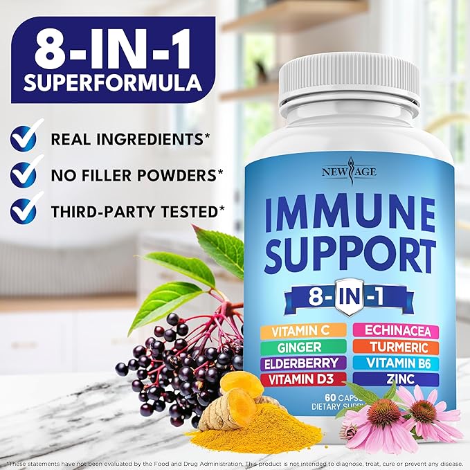 NEW AGE 8 in 1 Immune Support Booster Supplement with Echinacea, Vitamin C and Zinc 50mg, Vitamin D 5000 IU, Turmeric Curcumin & Ginger, B6, Elderberry 60 Count (Pack of 1)