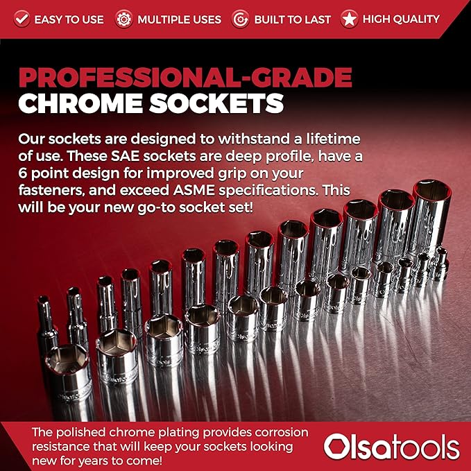 - Cr-V Material for Professional-grade Reliability|6-Point Design That Prevents Rounding of Nuts Bolts |Our sockets are made for the professional user exceeding ASME B107.110-2019 specifications by over 30%. First our sockets are forged from industrial-grade Chromium Vanadium (Cr-V) steel then machined to tight tolerances heat-treated polished and finally coated with a durable chrome plating for a protective mirror finish. These are not your average tools; these sockets are engineered for a lifetime of heavy professional use.|Sockets are the perfect companion for automotive work. By grabbing nuts and bolts on all six sides there is far less chance of rounding fasteners by using sockets compared to open-end wrenches. The sturdy Cr-V material used in these sockets allows for relatively thin walls allowing you to access nuts and bolts with tight clearances in hard-to-reach areas.|These socket sets include the most popular size range for Metric and SAE sockets. This set features a large font size stamping to help make it easy to keep your shop organized and save your time!| The 6 point sockets are designed for off-corner loading putting the force on the flats of the fasteners rather than the corners. This reduces the chances of rounding fastener heads and delivers the maximum amount of torque to reliably tighten and loosen difficult nuts and bolts. |Here at Olsa Tools we believe in providing you real value. That means we will never over-charge you for our professional tool-truck quality tools. Almost every tool you buy comes straight out of the same factories as the biggest tool truck brands in the world. All of our chrome sockets at Olsa Tools are backed by a Limited Lifetime Warranty 90-Day Risk-Free Return Policy and 100% Satisfaction Guarantee.|Sizes: 10 11 12 13 14 15 16 17 18 19 20 21 22 23 24 25 26 27 mm| Sizes: 3/8" 7/16" 1/2" 9/16" 5/8" 11/16" 3/4" 13/16" 7/8" 15/16" 1" 1-1/16" 1-1/8" 1-3/16" 1-1/4|Sizes: 4 4.5 5 5.5 6 7 8 9 10 11 12 13 14 15 MM|Sizes: 1/8" 5/32" 3/16" 7/32" 1/4" 9/32" 5/16" 11/32" 3/8" 7/16" 1/2" 9/16" 5/8"|Sizes: 6 7 8 9 10 11 12 13 14 15 16 17 18 19 20 MM|Sizes: 1/4" 5/16" 3/8" 7/16" 1/2" 9/16" 5/8" 11/16" 3/4" 13/16" 7/8" 15/16" 1"|Sizes: 10 11 12 13 14 15 16 17 18 19 20 21 22 23 24 25 26 27 mm|Sizes: 3/8" 7/16" 1/2" 9/16" 5/8" 11/16" 3/4" 13/16" 7/8" 15/16" 1" 1-1/16" 1-1/8" 1-3/16" 1-1/4"|Sizes: 4 4.5 5 5.5 6 7 8 9 10 11 12 13 14 15 MM|Sizes: 1/8" 5/32" 3/16" 7/32" 1/4" 9/32" 5/16" 11/32" 3/8" 7/16" 1/2" 9/16" 5/8"|Sizes: 6 7 8 9 10 11 12 13 14 15 16 17 18 19 20 MM|Sizes: 1/4" 5/16" 3/8" 7/16" 1/2" 9/16" 5/8" 11/16" 3/4" 13/16" 7/8" 15/16" 1"| Socket set material: (Cr-V)| Easy Selection: stamped markings.| 6-Point Socket Design: reduces the chances of rounding the fastener head