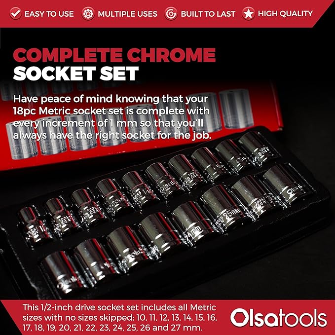 Olsa Tools Metric Shallow Socket Set - 1/2-Inch Drive, 18pc - 6-Point Chrome Sockets from 10mm–27mm and No Skipped Sizes - Mechanic Shallow Metric Socket Set - Professional Grade Sockets - Part: 1326