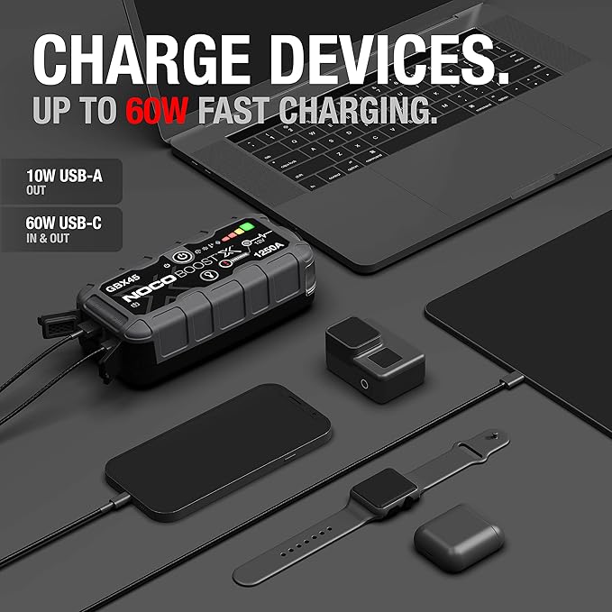 - WHAT’S IN THE BOX — GBX45 jump starter, heavy-duty clamps, USB-C charging cable, and microfiber storage bag. Backed by a 1-year warranty and engineered in the USA.