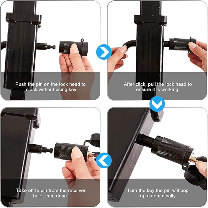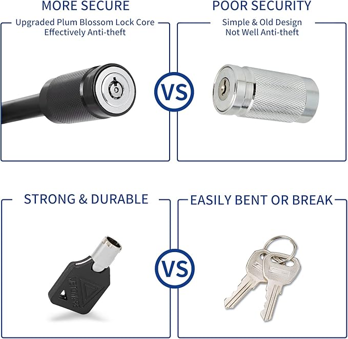 - [SECURITY OF HITCH LOCK] This towing hitch lock is made of black electrophoretic painted solid steel. Our upgraded Zinc alloy tubular lock core adopts more advanced anti-theft technology to improve safety. The pin lock made of heavy-duty steel is durably made and does so without being outrageously heavy.