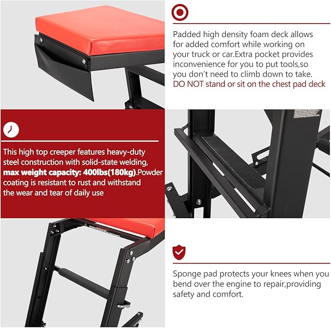 - HEAVY DUTY CONSTRUCTION: This high top creeper features heavy-duty steel construction with solid-state welding,max weight capacity: 400lbs(180kg).Powder coating is resistant to rust and withstand the wear and tear of daily use.