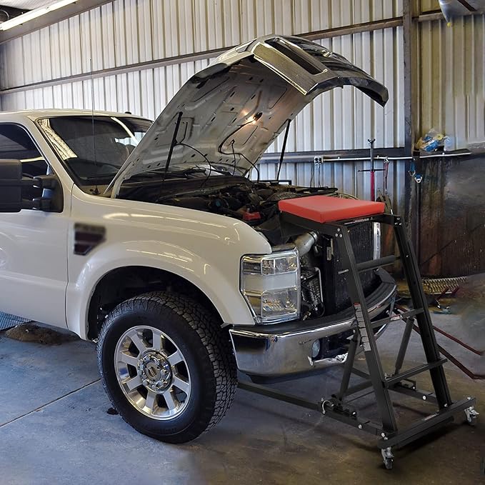 - CONVENIENCE & COMFORT: Padded high density foam deck allows for added comfort while working on your truck or car.Extra pocket provides inconvenience for you to put tools,so you don’t need to climb down to take.(DO NOT stand or sit on the chest pad deck).