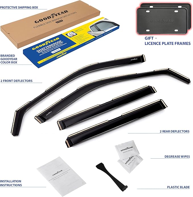 - Get a perfect gift right now - 2 Goodyear License Plate Frames are included in the set. No tools needed simply peal and stick these window vent visors rain guards. We include degreasing wipes to make the job quick. This vent shade is a great birthday gift or holiday present for anyone who likes to drive with the window down. Side window deflectors come in a Goodyear color box protected by a brown shipping box.