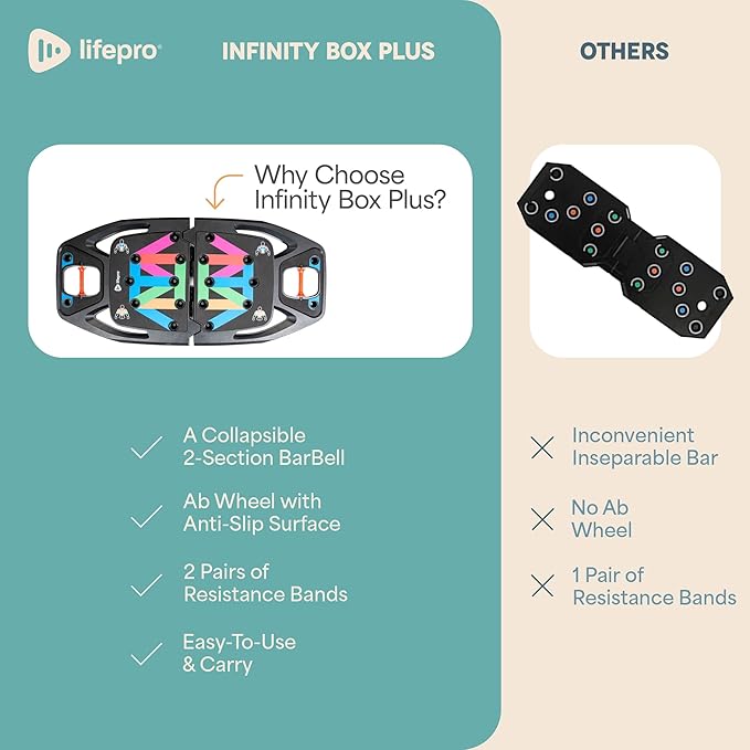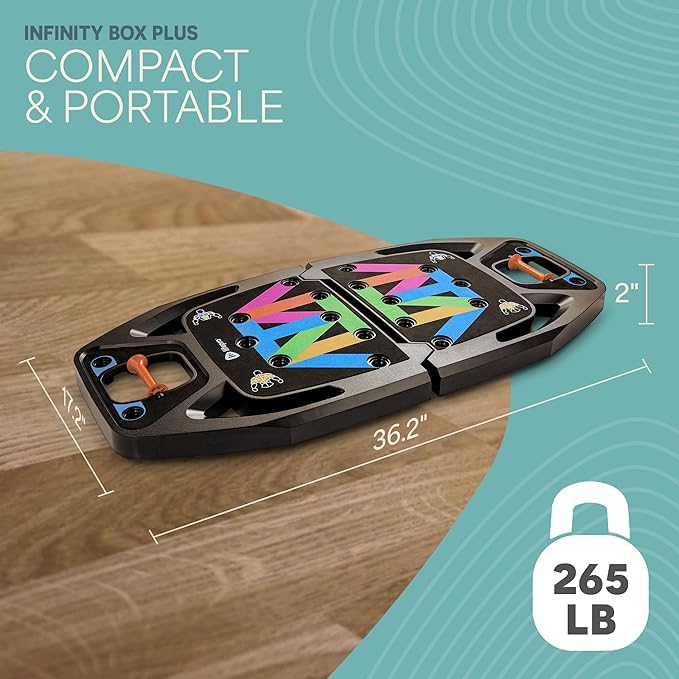 - STURDY AND SAFE BASE: Enhance your home training routine with Infinity Box Plus’s sturdy push-up board with convenient handles and the capacity to hold a maximum weight of 265 lbs. Use it for push ups or stand on it as a training base for several other exercises.