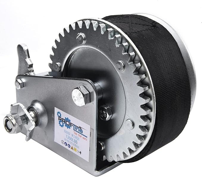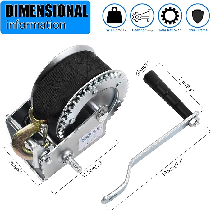 - 【Performance】: This 1200 lbs hand winch is made of high quality steel and provided with a nylon strap of 7 m (23 ft.). Zinc plated finish, mooring hook with a safety pawl and antislip handle consist of our dedication to design a durable, safe and easy-to-use manual winch for you.