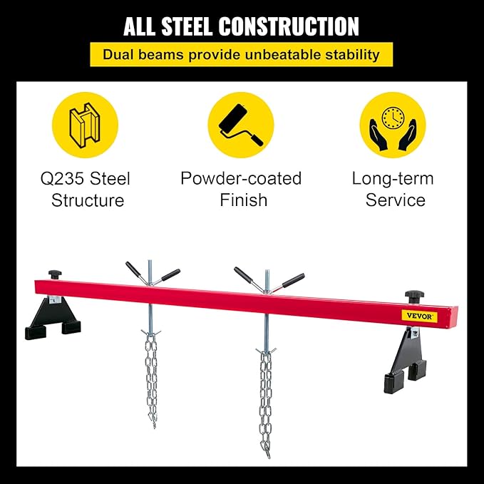 - Dual Steel Bar: The engine support bar is made of heavy-duty steel with a protective powder coat finish, high rigidity, and resistance. The dual steel bar build means this engine bar can support your engine or transmission through long rebuilds.