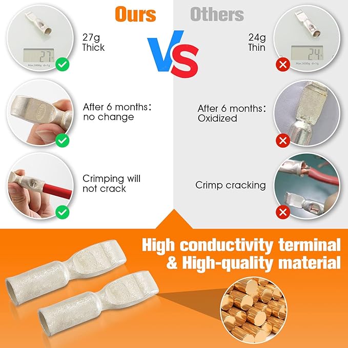 - ๐๐ข๐ ๐ก ๐๐จ๐ง๐๐ฎ๐๐ญ๐ข๐ฏ๐ข๐ญ๐ฒ - The terminals of these winch battery quick connect are made of high-conductivity silver-plated copper, ensuring stable voltage and current. Additionally, they are specially treated to prevent cracking during crimping