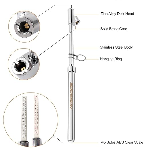 - 2.ACCURATELY MEASURE THE TIRE PRESSURE:Two-side ABS bar calibrated:10-150 psi / 1-10bar; 2 psi increment,Easy read printed clear scale .Perfect for truck, car, suv, rv, atv, bike or motorcycle with schrader valve