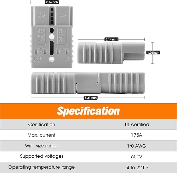 - ๐๐ข๐ฆ๐ฉ๐ฅ๐ ๐๐ง๐ฌ๐ญ๐๐ฅ๐ฅ๐ฅ๐๐ญ๐ข๐จ๐ง - Suitable for 1/0 AWG cables; voltage rating of 600V; capacity of 175A. Simply insert the cable into the terminal (diameter: 0.433 inches), solder or crimp the terminal, then slide the terminal into the plug and lock it into place for connection