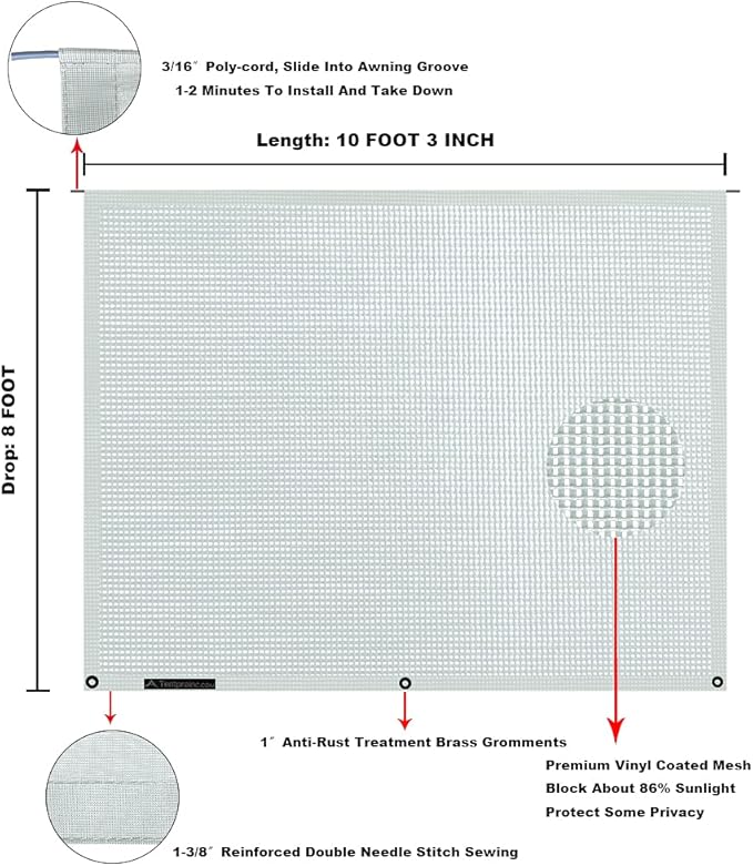 Tentproinc RV Awning Sun Shade Screen 8' X 10' 3'' (Fit for 11' Awning) Mesh Screen Sunshade Sunscreen for Motorhome Camper Trailer Awning Screen Shadescreen UV Blocker - 3 Year Warranty (Gray)