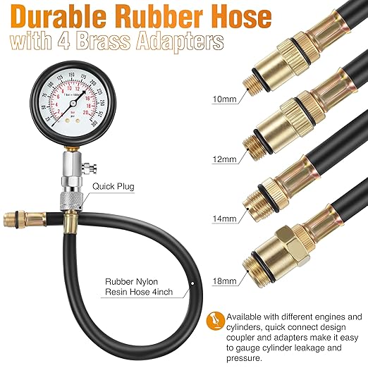 - 【Complete Kit for Car Testing】: the 9pcs cylinder testing kit comes with 8 x compression tool and 1 x spark plug tester, total package includes 1 x SPARK PLUG TESTER, 1 x 300PSI DUAL UNITS GAUGE, 1 x STRAIGHT RUBBER CONE ADAPTER, 1 x CURVED RUBBER CONE ADAPTER, 4 x BRASS ADAPTERS, and 1 x 14-inch EXTENSION HOSE, complete package allows you to test the car’s condition easily by yourself