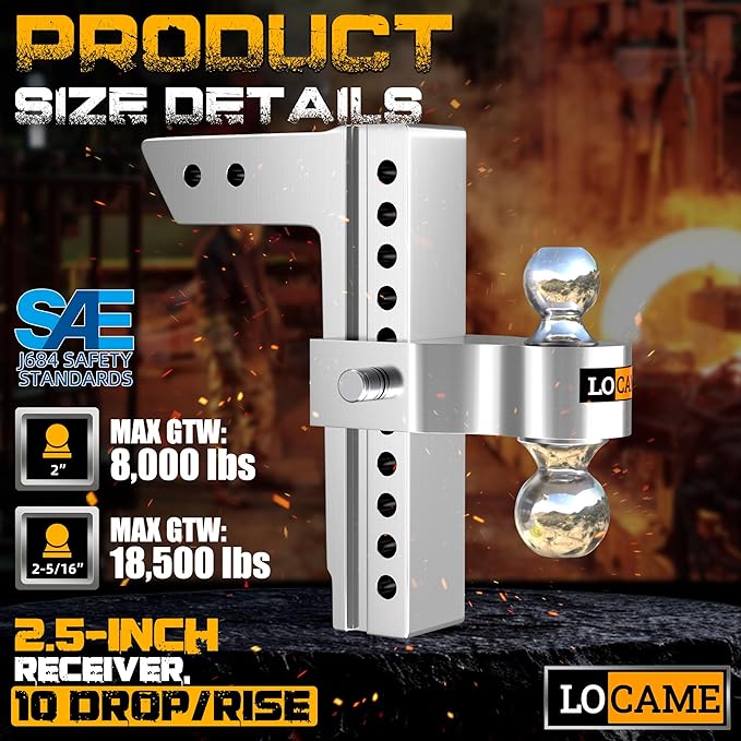 LOCAME Adjustable Trailer Hitch, Fits 2.5-Inch Receiver Only, 10-Inch Drop/Rise Aluminum Drop Hitch,18,500 LBS GTW-Tow Hitch for Heavy Duty Truck with Double Stainless Steel Locks, Silver, LC0009