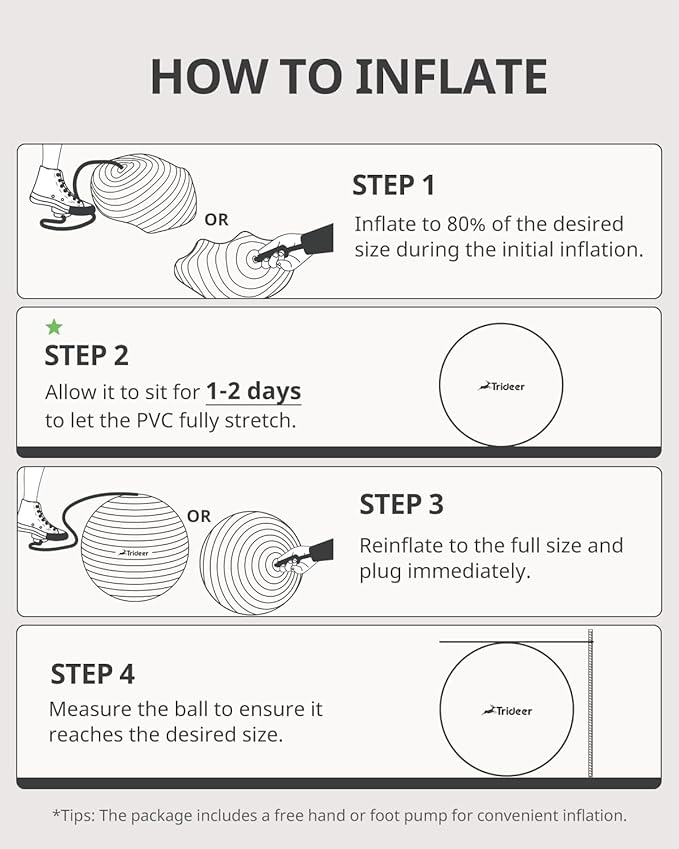 - EASY INFLATION- Trideer exercise ball comes with a quick inflation pump (45/55/65cm equipped with a hand pump; 75/85cm equipped with a foot pump), 2 air stoppers, and detailed instructions; available in 5 sizes to meet all your needs.