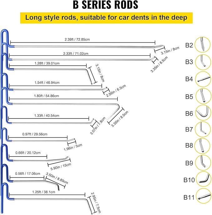 - 21pcs Dent Removal Rods: Includes 21 PCS dent removal rods of different sizes (A2-A6, B2-B11, C1-C6). This rod set belongs to long-style rods with different shapes of tips. The length range is 0.72 ft to 2.69 ft. Especially suitable for car dents in the deep where our hands are inaccessible.