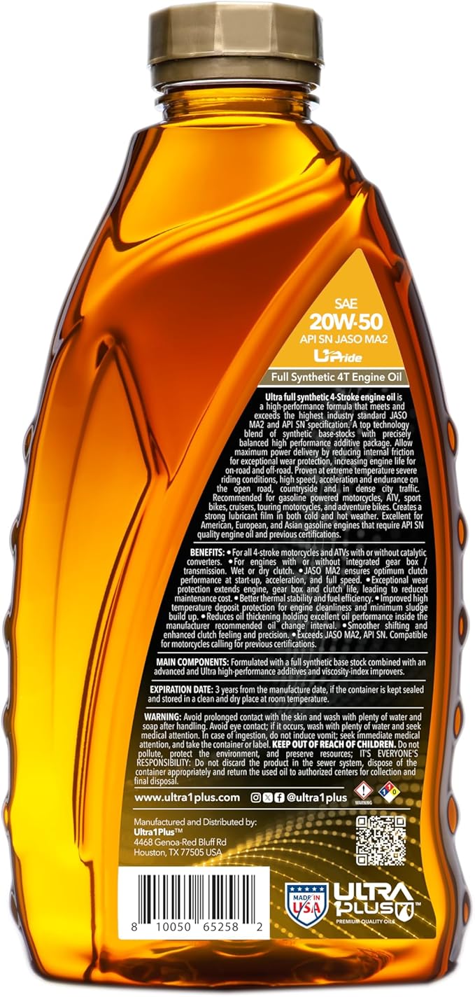 ULTRA 1PLUS 4T 20W-50 Full Synthetic Motorcycle Oil API SN JASO MA2-20W50 Motor Oil, 12 Quarts