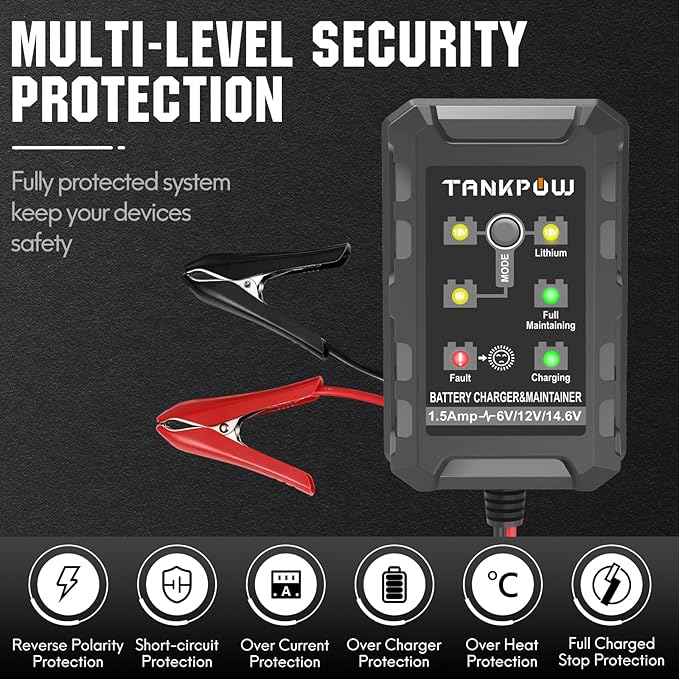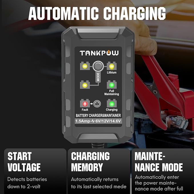 - [Easy-To-Use]:One click function selection and charging automatic locking to ensure charging safe.Not only a charger, but also a battery maintainer.Tankpow battery charger with 6-foot output cord, fused-ring terminal harness for hard-to-reach batteries and alligator clip accessory cables to meet your needs.