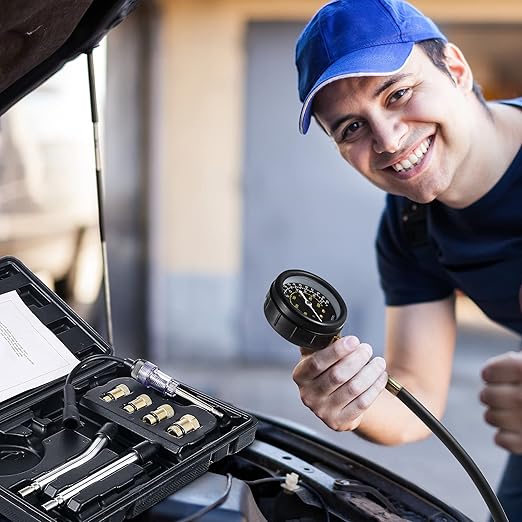 - 【Easy and Safe to Use】: first, remove the fuel pump and fuel-injection fuses, disconnect the main wire to the coil and spark plug wires, and remove spark plugs; And then start the threaded end of the compression gauge in a spark plug hole by hand; Last, turn the ignition on, depress the throttle, and crank the engine four revolutions to get accurate data