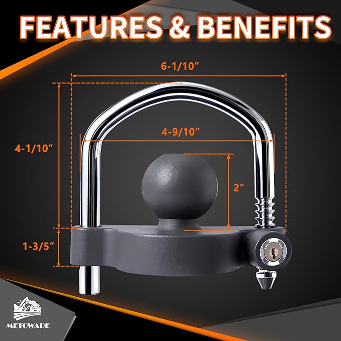 - UNIVERSAL TOW BALL COUPLER LOCK – This universal trailer hitch security adjustable lock fits 1-7/8”,2”,2-5/16” couplers and ratchet is adjustable with 11 locking positions.The core of the lock is made of premium zinc alloy tubular and combines with the last anti-theft technology. The new design of the lock core makes it lock more secure.