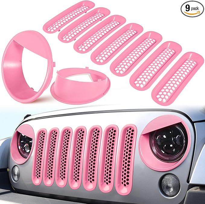 Front Grille Mesh Inserts & Headlight Cover for Jeep Wrangler JK JKU Sport Freedom Rubicon Sahara Unlimited 2007-2018 Exterior Accessories Clip-in Grille Guard Headlight Bezels Trim (Matte Pink)
