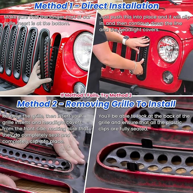 - Great Compatibility — Perfectly fit for 2007-2018 Jeep Wrangler JK JKU Sport Freedom Rubicon Sahara Unlimited 2-Door and 4-Door (Only Fit Original Factory Front Grill). (NOT FIT 2016-2018 Jeep Wrangler Unlimited Sahara or 2018 JL)
