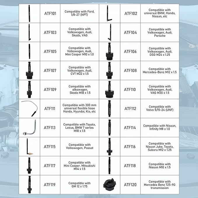 - [Complete ATF Filling Adapters] - Equipped with 21PCS simple push-on coupler design adapters to work with ATF transmission fluid system, which perfectly compatible with VW, BMW, Benz, Ford, Chevy, Buick, Lexus, Volvo, Honda and more. Body printed clear model number for easy identify.