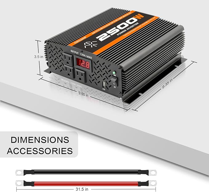 - 2.【Safe charging technology& Stability】: This 2500W inverter has 10x30A built-in fuses to protect the inverter and your device from short circuit current ; Its stable charging technology protect the 12V car inverter against overheating, under and over voltage charging, short circuiting, overloads, and overcharging.