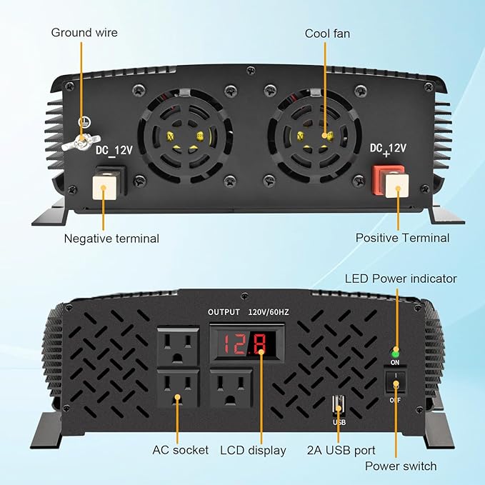 - 4.【Silent t& powerful cooling fan】: Being equipped with 3 powerful fans ,The 12 volt car inverter can realize fast heat dissipation. Its smart cooling fan system only works when the device gets warmer or output power exceeds, slows down and stops working when the temperature gets down. making the truck inverter work silently most of time.