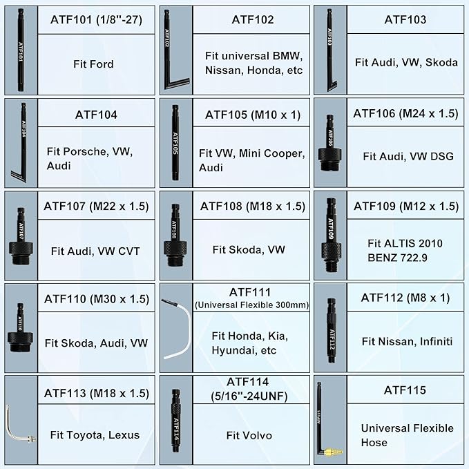 - ATF Adapters: There are 15 specific ATF adapters included in this pneumatic ATF fluid pump kit, installed on the car oil pan and perform transmission fluid refill service for the ATF filler system. Multiple adapters constructed from hardened steel for maximum strength and longevity. Black electrophoretic finish for rust and corrosion resistance. Kit is suitable for Ford, BMW, Nissan, VW, Audi, Toyota, Volvo, Porsche, Benz, Hyundai, Infiniti, Lexus and etc