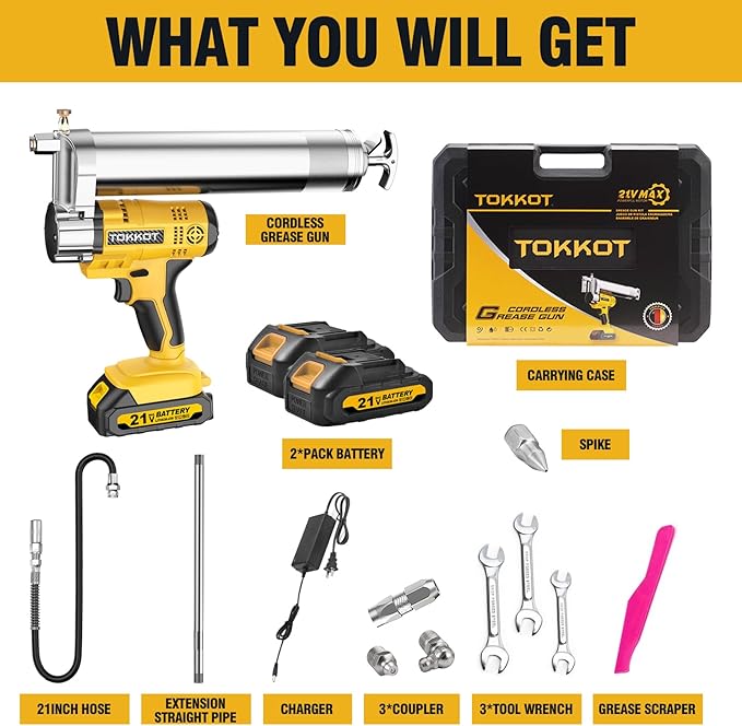 - [What You Will Get]: 1* Electric Grease Gun, 2* 21V Batteries, 1* Charger, 1* 21 Inch Hose, 1* Nozzle, 3* Coupler, 3*Tool Wrench,1* Extension Tube, 1*Grease Scraper, 1* Carrying Case, 1* User Manual. 14pcs include. Tips: In order to bring you a better using experience, please fully charge the batteries before using the product after receiving it