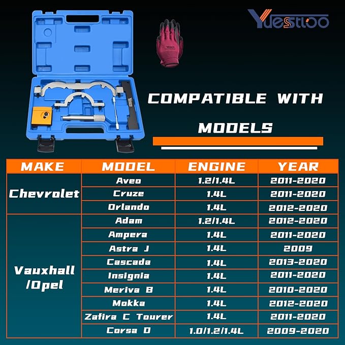 Turbo Engine Timing Tool Kit for Vauxhall Opel Chevy Chevrolet Aveo Cruze Orlando Adam Ampera Astra J Cascada 1.0 1.2 1.4 L, Camshaft Holding Locking Tool Set with Case & Gloves