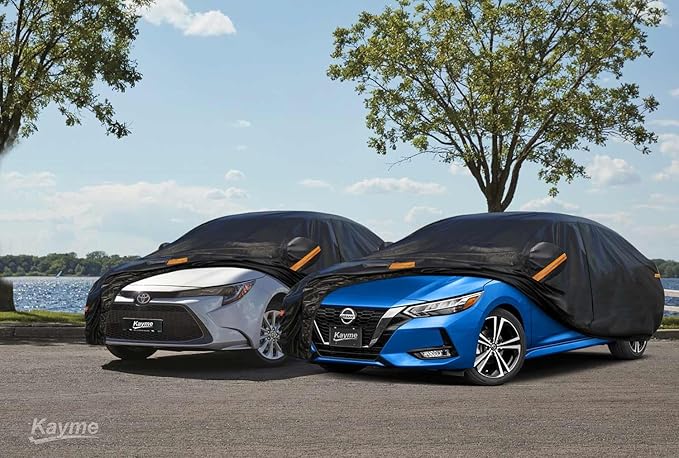 - 【Complete Protection】- No matter hot sun or cold weather, Kayme all weather car covers like a moving garage can handle it all. The powerful material keeps your car safe from UV, sun, rain, snow, frost, dust, sand, leaves, branches and birds dropping. It provides complete protection for your vehicle.