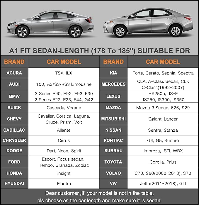 - 【Dimension A1】- Universal fit for sedan which length is 178 to185 inch (Not for Hatchback and SUV). Suitable for Nissan Sentra, Toyota Corolla/ Prius, BMW 3 Series, Ford Focus Sedan, Hyundai Elantra, Kia Forte/Cerato, Lexus IS250/300/350, Mitsubishi Lancer, Subaru Impreza/wrx, vw Jetta etc.