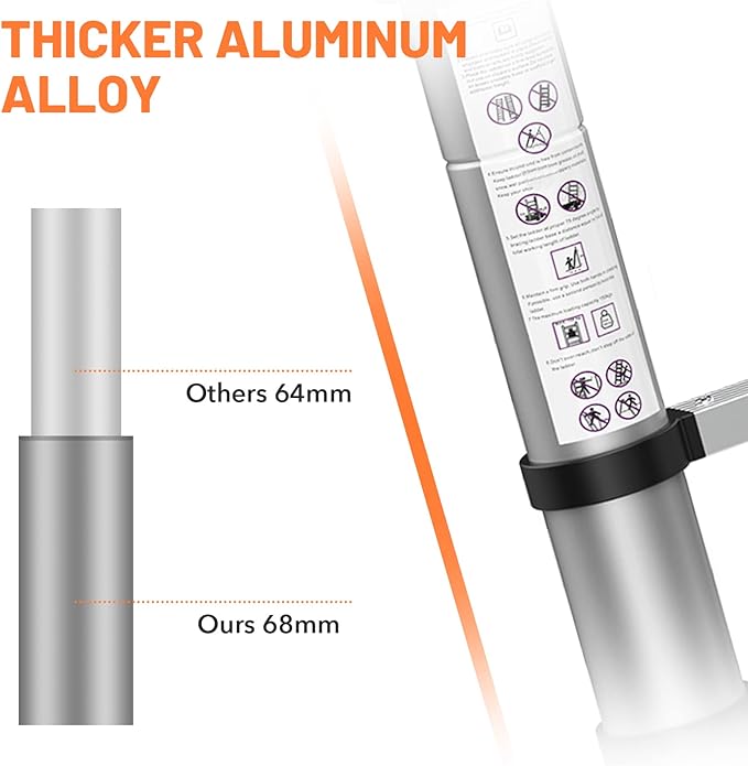- đăRobust Frame & Anti-skid Designă scientific and solid structure is adopted. Our telescopic ladder has passed the certification of safety standard EN131, and its load-bearing capacity is up to 330 pounds. In addition, the anti-slip cap is carved with deep horizontal stripes and ultra-wide steps to ensure your safe climbing.