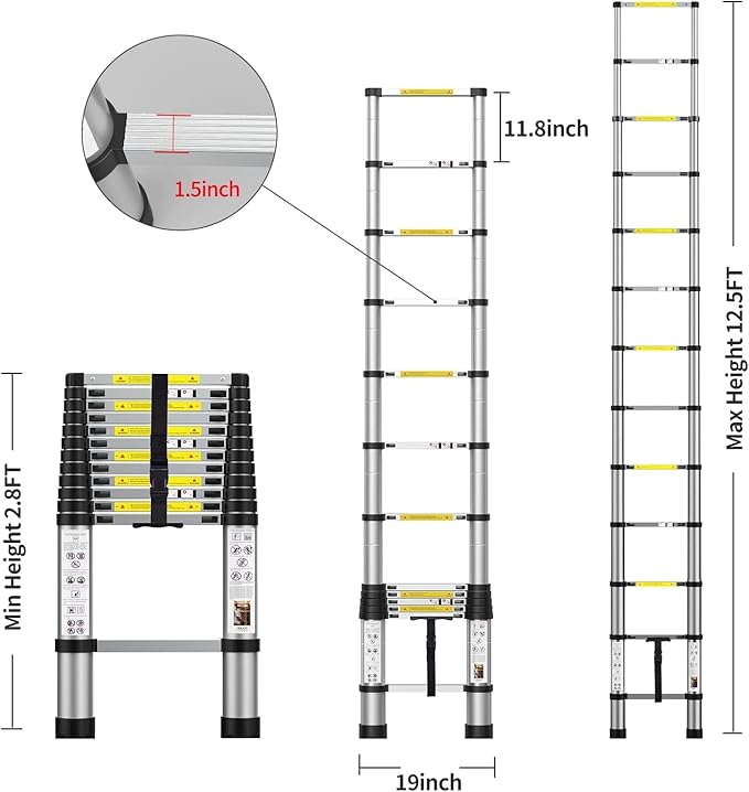 - đăMulti-functional Commercial & Domestic Useă The adjustable extension ladder allows users to extend the height from 3.5 feet to 15.5 feet according to their needs. People can use it for daily life or hobbies, such as changing light bulbs, painting walls, cleaning windows, climbing trees, and using it as attic ladders. I believe that this small giant ladder can bring great convenience to people's lives.