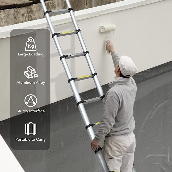 - đăPremium Aluminium Telescoping LadderăFEETE telescopic ladder is made of premium aluminum material. High quality nylon fiber reinforced plastic parts ensure that the extension ladder has sufficient load capacity and stability. The retractable ladder's 330 lbs maximum weight capacity can meet most of the use conditions.