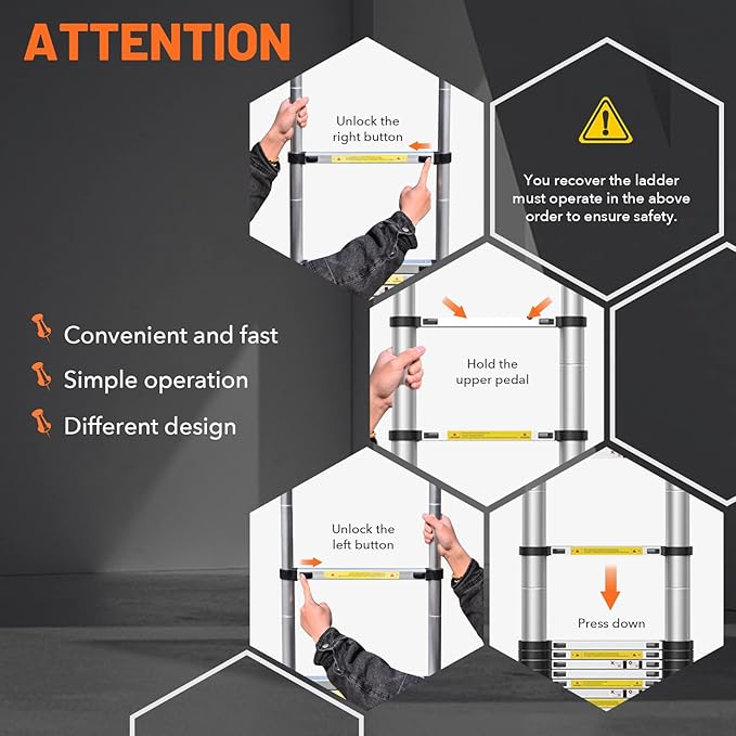 - đăUsage Guidelineă1: Please unfold the ladder from the top upwards (please make sure that you can hear a "click" sound when each part is unfolded, indicating that itâs locked) 2: Place the ladder against a wall to ensure it is stable.ăRetraction stepsă1: Hold the upper section or both treads of the ladder with one hand 2: Push the left and right latches with the other hand, and then control the ladder to descend slowly (Note: please retrieve the ladder from the bottom section upwards in order)