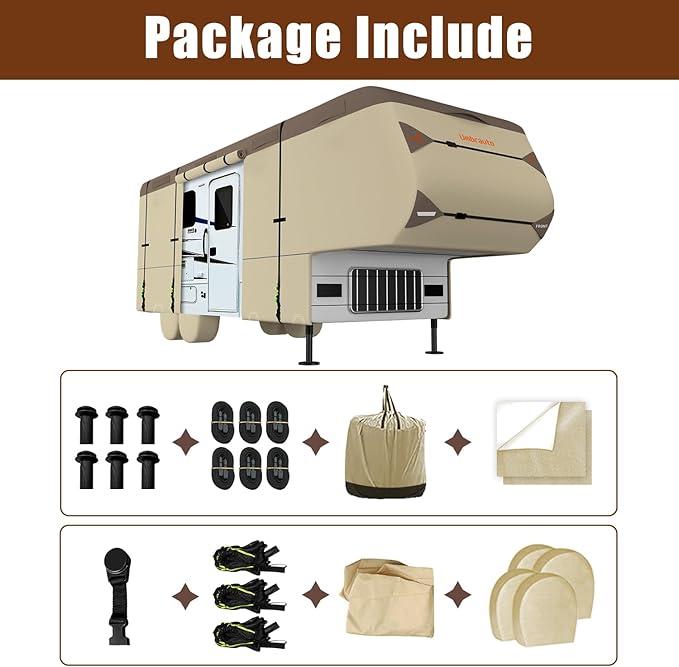 - Accessories: Includes 1 fifth-wheel cover that fits RVs (please measure before purchase!); 1 storage bag; 6 gutter covers with sponge (for better protection of sharp parts of the RV); 1 adhesive repair patch; 1 ladder cover; 6 straps, 3 windproof straps, and 4 tire covers.