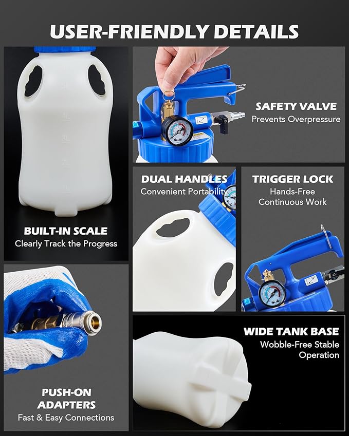 - USER-FRIENDLY DESIGN: The transparent hoses let you monitor progress and inspect fluid quality; the built-in pressure gauge offers real-time readings; the hangers keep tools organized, and nitrile-coated gloves protect your hands from corrosive oils