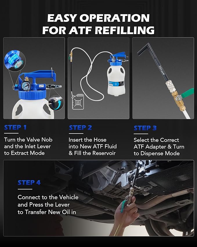 - UNIVERSAL COMPATIBILITY: Our pneumatic transmission fluid extractor and dispenser comes with 15 ATF refill adapters for most cars and a tool case for easy storage and transport; the 1/4 NPT air control inlet connects quickly to any standard air compressor