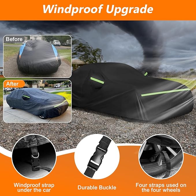 - 【Upgraded Windproof Design】1. Four wheel straps ensure cover stays in place. 2. Windproof buckle through the middle of the car. 3. Elastic Straps at front and rear for secure fit and protection against heavy wind. 4. Enhanced durability with elasticized bands and double-stitched seams.